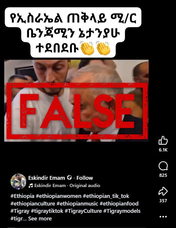 Si bien la Guerra de Gaza se acerca a su segundo año, una desinformación en el conflicto continúa extendiéndose en África. Un video que circula en Facebook en Etiopía afirma mostrar al primer ministro israelí Benjamin Netanyahu golpeado por una multitud de personas. Sin embargo, es falso: el hombre del video no es Netanyahu, sino Eli Dalal, un legislador del Partido de Likoud del Primer Ministro que se cayó mientras intentaba abrirse camino a una multitud de manifestantes el 20 de septiembre de 2025.