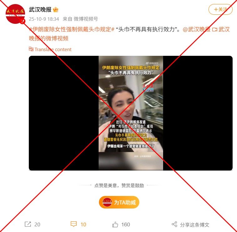 Las mujeres en Irán están traspasando cada vez más los límites del estricto código de vestimenta islámico del país, pero sigue vigente una ley que exige que las mujeres usen el hijab, según grupos de derechos humanos y un portavoz del gobierno. La afirmación falsa apareció en publicaciones en las redes sociales en idioma chino, citando a un asesor del gobierno iraní que dijo en octubre de 2025 que no existía “ninguna ley obligatoria sobre el hijab”; Más tarde se retractó de esos comentarios y dijo que se debían cubrir la cabeza.