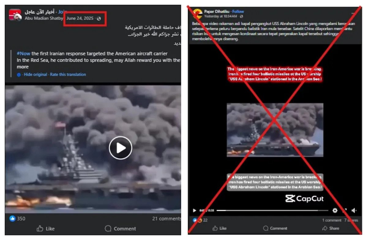El vídeo fue compartido en Facebook Y Instagram en mensajes escritos en birmano, Francés, Español Y árabe después de que Irán lo dijera golpeado el USS Abraham Lincoln con misiles balísticos en el Golfo el 1 de marzo (enlace archivado).
