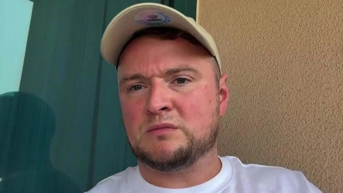 Un hombre con cabello castaño corto sentado en una habitación de hotel mira una cámara