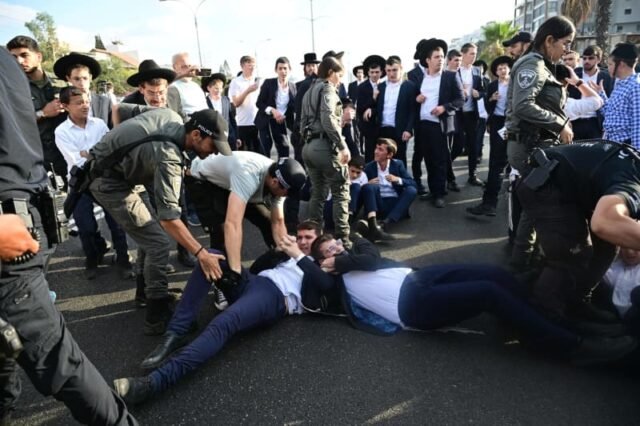 Judíos ultraortodoxos se enfrentan a la policía durante una manifestación contra el servicio militar obligatorio de las FDI, cerca de Bnei Brak, el 2 de marzo de 2025 (crédito: YONATAN SINDEL/FLASH90)