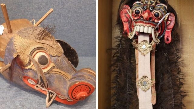Otros objetos incluyen representaciones de Barong y Rangda, dos figuras centrales de la mitología balinesa.