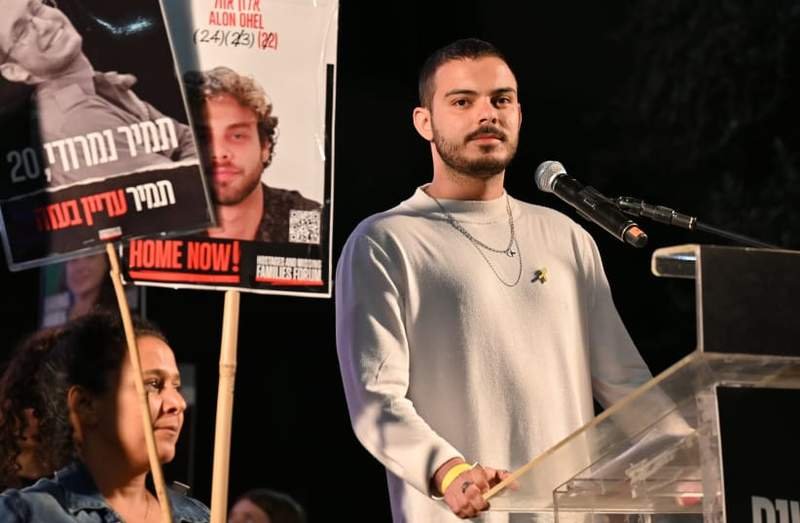 El rehén liberado Omer Wenkert habla durante una manifestación en la Plaza de los Rehenes en Tel Aviv, el 5 de abril de 2025. (Crédito: Paulina Patimer)