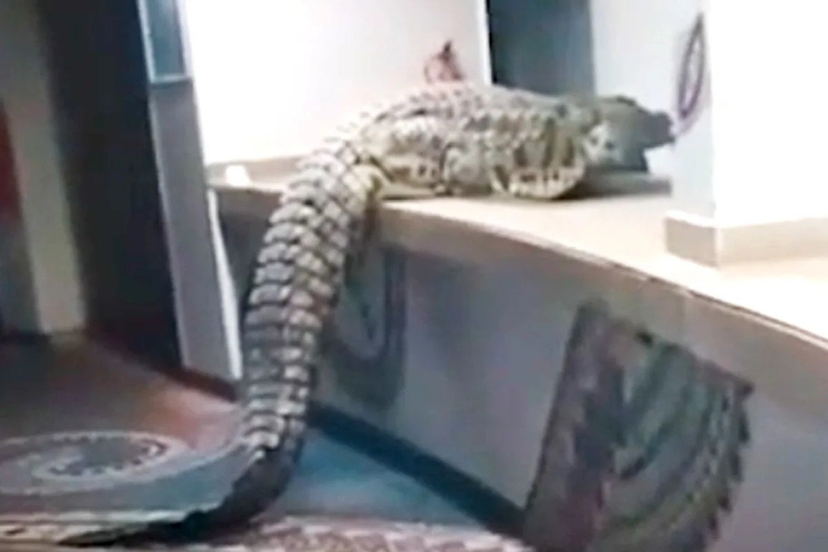 Un cocodrilo de 4 metros de largo sorprende a los turistas mientras entra al restaurante del hotel en busca de comida antes de tumbarse en un sillón