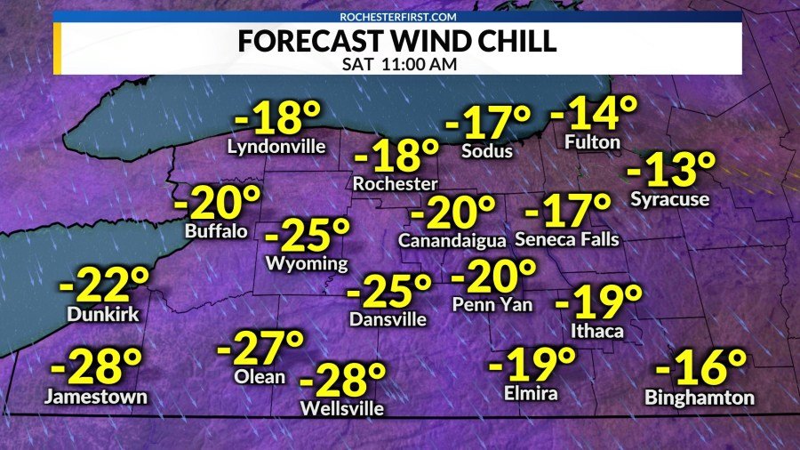 Ha sido un invierno duro en WNY. Puedo presentar un argumento convincente este fin de semana y tal vez me lleve la palma. Una ráfaga de aire ártico y la nieve con efecto de lago que la acompaña sumergirán el área de Rochester en una zona helada desde el viernes por la noche hasta el domingo. El viernes pasará por encima un potente sistema cortacésped. Inicialmente, el flujo del suroeste mantendrá las temperaturas en los 20 grados con ligeras lluvias de nieve volando. A medida que pase el frente ártico, los vientos cambiarán bruscamente hacia el noroeste, con ráfagas que en ocasiones alcanzarán las 40 mph. A medida que las temperaturas bajen a un solo dígito, los valores de sensación térmica caerán entre -10 y -20° el sábado por la mañana. En Finger Lakes y la zona sur, estos fríos podrían acercarse a los -25°.