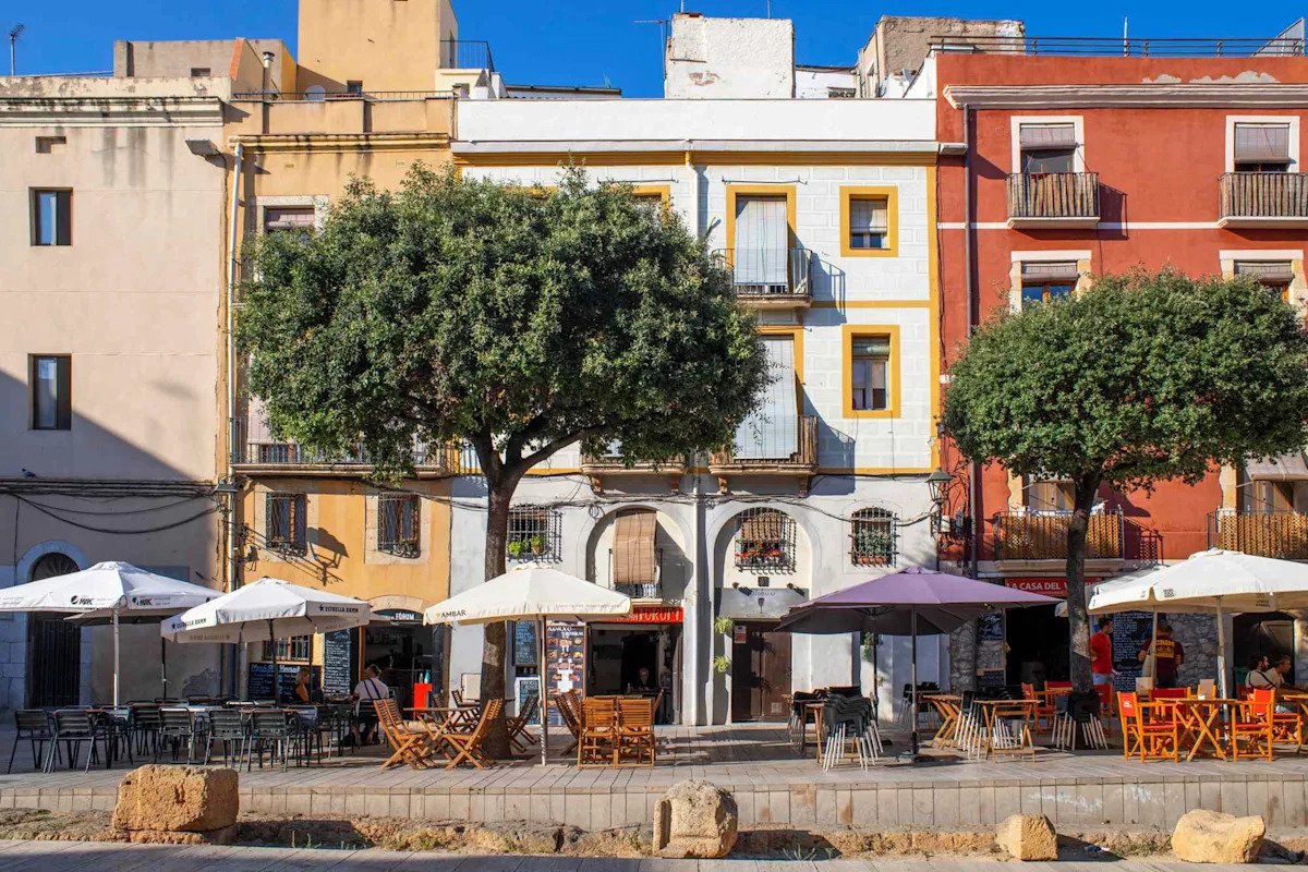 Esquina de un restaurante al aire libre con mesas y asientos vacíos en España