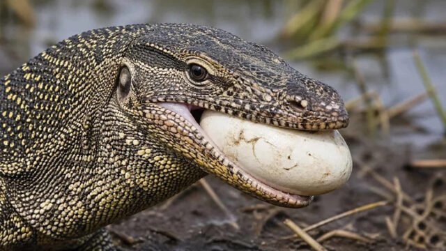 Mientras gatea hasta la cima del nido, nos sorprende la vista de un bebé. cocodrilo. Parece ser un cocodrilo muy joven, quizás una cría reciente. Es un momento tenso porque se sabe que los lagartos monitores del Nilo atacan nidos de cocodrilos, comen huevos y se alimentan de cocodrilos pequeños. En cambio, el lagarto monitor hurga en el nido y pronto recoge un gran huevo de cocodrilo en su boca. El lagarto lucha por romper el huevo para beber su contenido y finalmente lo logra, tragándose también la cáscara triturada.