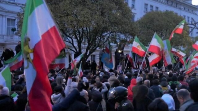 Un manifestante subió al balcón de la embajada iraní en el oeste de Londres mientras cientos de personas se reunían frente al edificio, ondeando banderas y coreando consignas antigubernamentales.