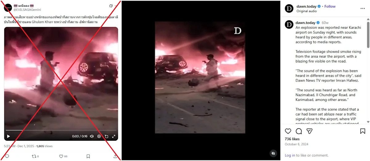 Las tensiones entre Pakistán y Afganistán siguen siendo altas después de semanas de intensificación de los enfrentamientos fronterizos a pesar de una tregua en octubre, pero un vídeo de vehículos envueltos en llamas que circula en las redes sociales no muestra un convoy militar emboscado por los talibanes cerca de la frontera como se afirma. El vídeo había circulado previamente en noticias en octubre de 2024 sobre una explosión cerca del aeropuerto de Karachi que mató a dos ciudadanos chinos.