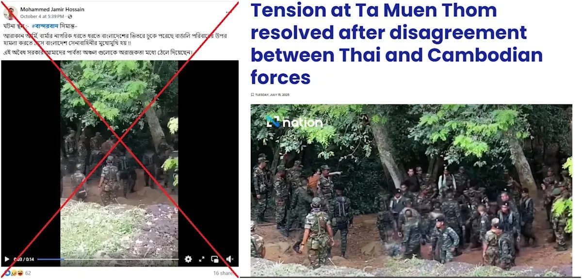 Días después de que tres personas murieran durante protestas violentas en el distrito de Khagrachari en Bangladesh, circuló en publicaciones un video de soldados con uniforme militar que afirmaba falsamente que mostraba a un grupo étnico armado del vecino Myanmar ingresando al país. En realidad, el clip muestra una discusión entre soldados camboyanos y tailandeses en un controvertido templo fronterizo, que ocurrió más de dos meses antes de las protestas en la región fronteriza sureste de Bangladesh.