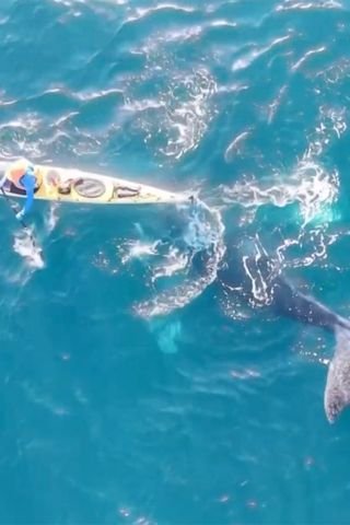 En el clip, la cría de ballena nada hacia los kayaks, levantando su nariz cerca de los botes, de modo que casi toca las puntas de los kayaks. Pero antes de que la cría se acerque demasiado, se sumerge más profundamente en el agua azul. Otras tomas muestran al gentil gigante salpicando juguetonamente a los kayakistas.