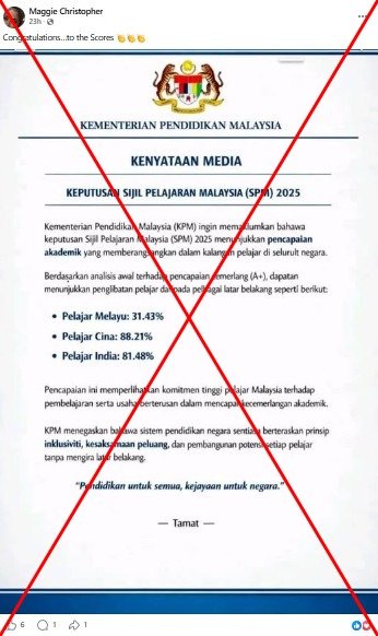 “El Ministerio de Educación (MOE) nunca ha emitido ninguna declaración sobre los resultados raciales de Sijil Pelajaran Malaysia (SPM) 2025, tal como circuló en línea”, decía el mensaje en malayo.