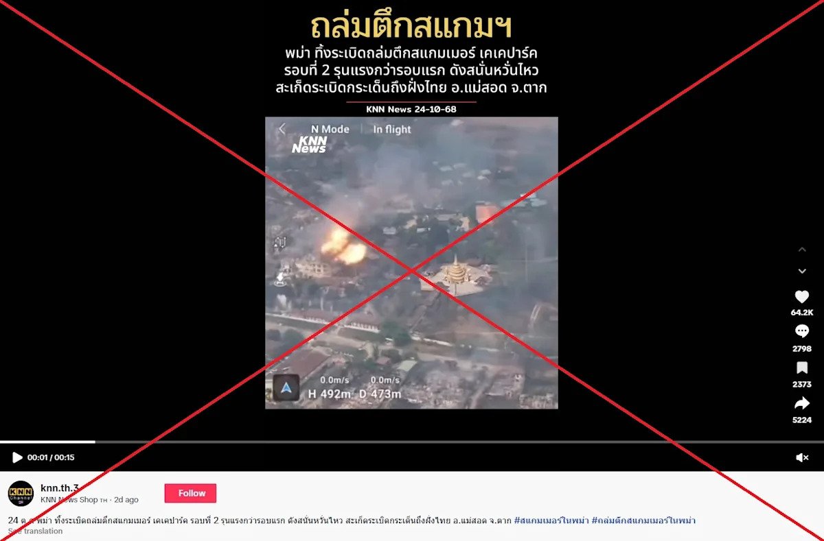 Tras las redadas militares de Myanmar contra centros de ciberestafa en octubre de 2025, que provocaron que más de 1.000 personas huyeran a Tailandia, los usuarios de las redes sociales compartieron un vídeo de un ataque de meses de antigüedad, afirmando falsamente que mostraba uno de los centros de ciberestafa siendo bombardeado. las fotos En realidad, representa un ataque aéreo contra un monasterio en Indaw, al norte de Myanmar, en abril de 2025.