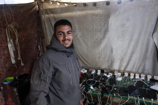 Deir el-Balah, Franja de Gaza – Cada mañana, Abdel Karim Salman comienza su rutina saliendo a la calle con su propio teléfono y el de su mujer, ambos completamente descargados. Se dirige a una estación de carga cercana para enchufarlos y cargarlos nuevamente.