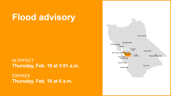 El condado de Alameda está incluido en un aviso de inundación emitido por el Servicio Meteorológico Nacional a las 3:01 a.m. del jueves. El aviso está vigente hasta las 6:00 a.m.