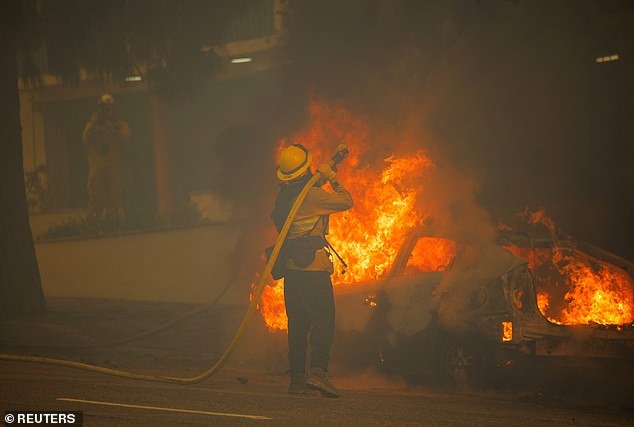 Un bombero del condado de Los Ángeles combate el incendio forestal de Palisades mientras un coche arde
