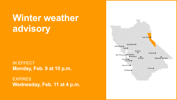 El Servicio Meteorológico Nacional emitió un aviso de clima invernal a las 11:07 a.m. del sábado a partir de las 10 p.m. Lunes a 4 p.m. Miércoles 11 de febrero para la región del Gran Lago Tahoe.