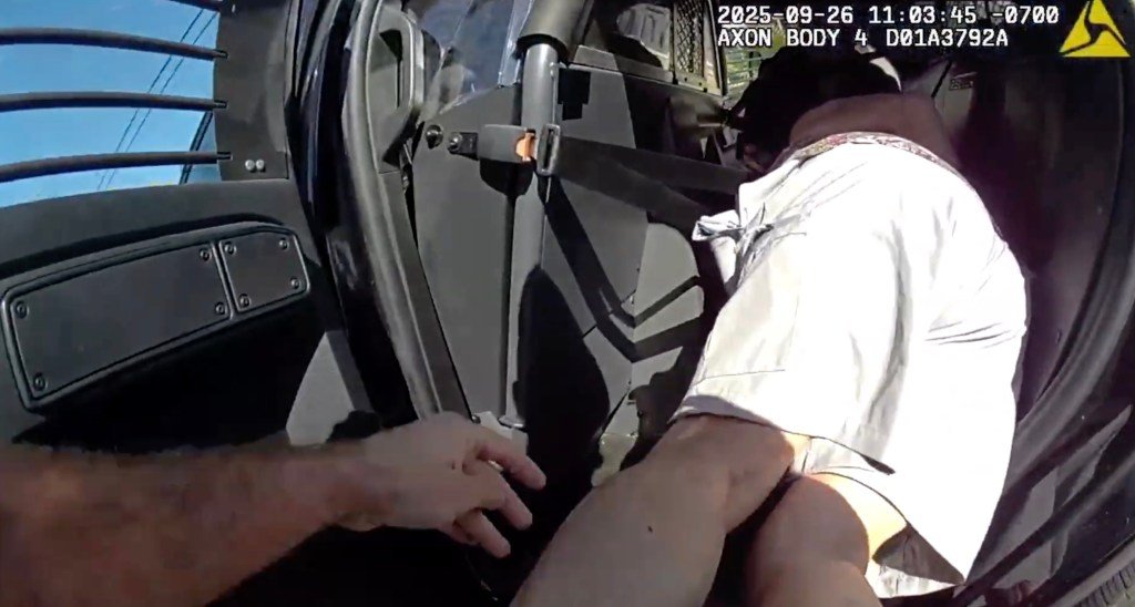 “No me des ningún motivo para volver a esposarte”, se puede escuchar a un oficial decir.