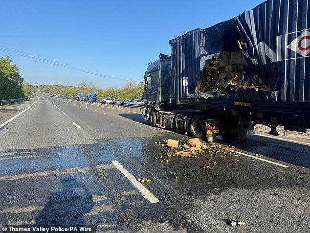 Cartones de Prosecco se derramaron sobre la carretera desde uno de los camiones, dejando “basura significativa” y “vidrios rotos por todas partes”, mientras que el contenedor vacío del otro camión fue desalojado, dijo el equipo de vigilancia vial de la policía de Thames Valley en las redes sociales.