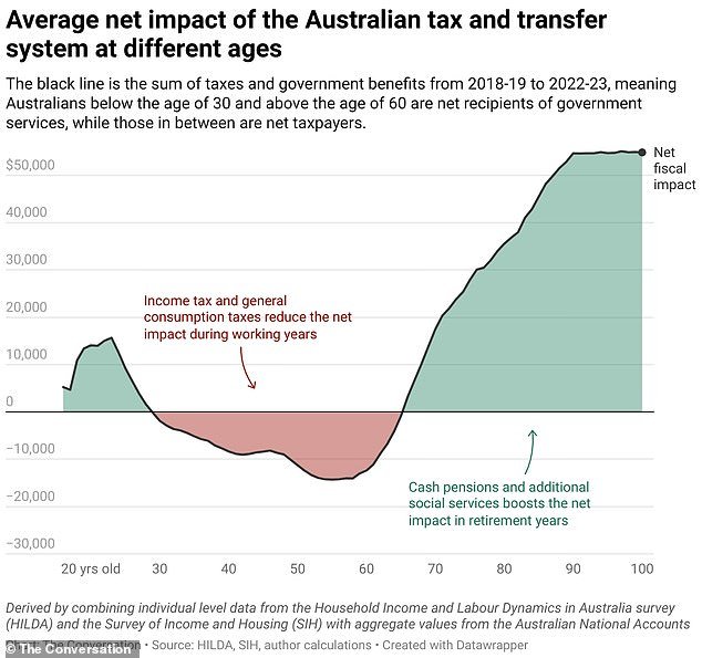 Luego contribuyen más en impuestos de lo que reciben del gobierno cuando son más productivos, antes de beneficiarse nuevamente del exceso de transferencias (más pagos recibidos que impuestos pagados) más adelante en la vida, a medida que su productividad disminuye y disfrutan de la jubilación.