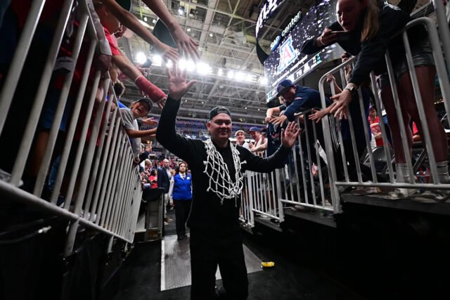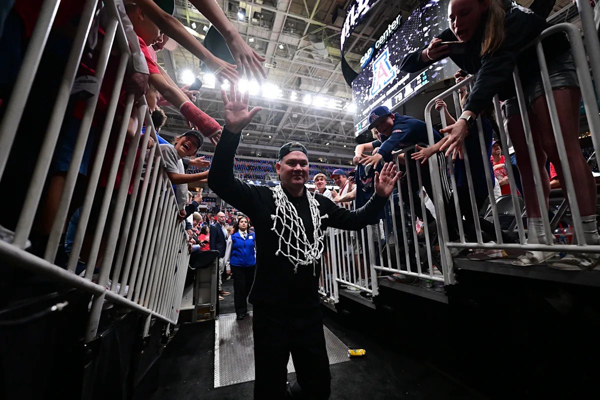 Tommy Lloyd saluda a la multitud después de que Arizona venciera a Purdue en el Elite Eight del Torneo de la NCAA 2026. (Fotos de Bob Drebin/NCAA vía Getty Images)