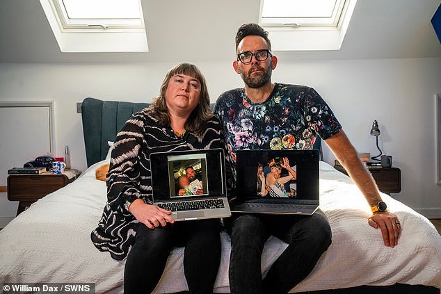 Jaime, de 46 años, y su compañero Noah Fagan con las fotos que encontraron en línea de su fabricante celebrando con su dinero