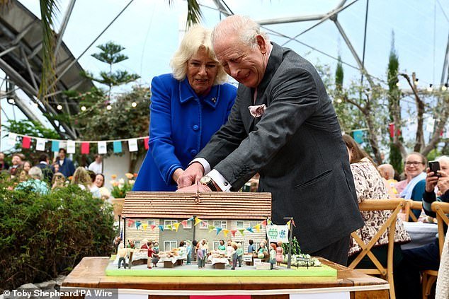 El Rey y la Reina se unieron para cortar un pastel de espada conmemorativo durante su visita hoy al Proyecto Edén en Cornualles.