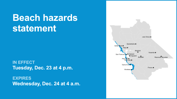 La costa norte de la Bahía, incluida la costa nacional de Point Reyes, la costa de la península de San Francisco, el norte de la Bahía de Monterey, el sur de la Bahía de Monterey y la costa de Big Sur, así como el condado de San Francisco, están sujetas a una declaración de peligro de playa emitida por el Servicio Meteorológico Nacional el martes a las 4:28 a. m. La declaración está en vigor desde las 4 p. m. hasta las 4 a.m. del miércoles 24 de diciembre.