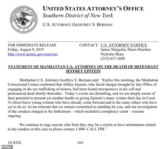 En el comunicado, el entonces estadounidense. El abogado Geoffrey S. Berman dijo: “Esta mañana temprano, el Centro Correccional de Manhattan confirmó que Jeffrey Epstein, quien enfrentaba cargos presentados por esta oficina por tráfico sexual de menores, fue encontrado inconsciente en su celda y declarado muerto poco tiempo después.