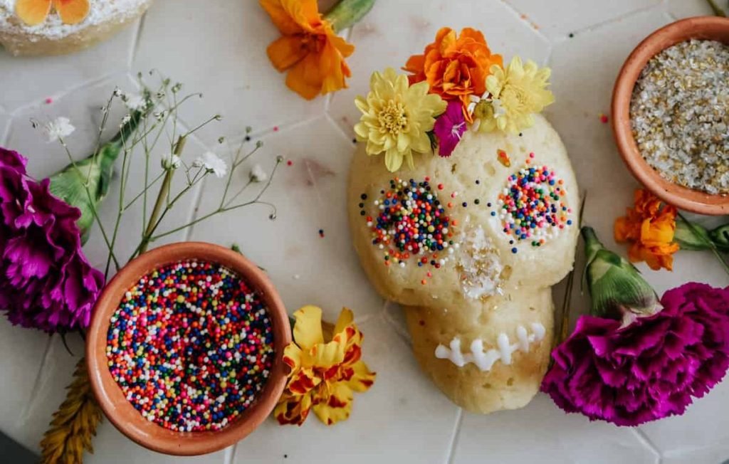 pueden felicitar sus clásicas calaveras de azúcar mexicanasque están hechos de azúcar pura, están destinados únicamente a la decoración de la ofrenda y brindan dulces refrescantes. También es divertido decorarlos y compartirlos.