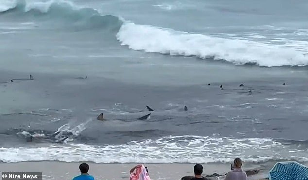 El enjambre de tiburones en Snapper Rocks fue visto el martes persiguiendo y alimentándose de bolas de cebo (densos bancos de peces pequeños) en las aguas poco profundas.