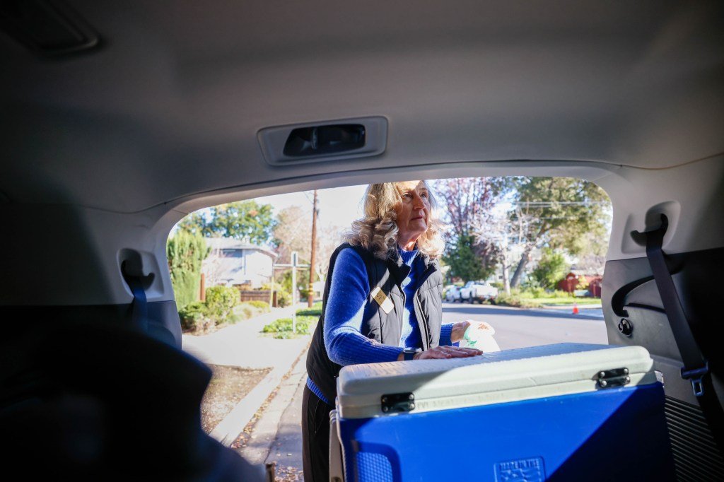 Stephanie Figeira, directora de servicios de nutrición del programa, fue recibida por Larry Dahl, de 74 años. Recibe comidas los martes y jueves. Dahl, que alguna vez fue un habitual del campus de la Universidad de Stanford, ahora pasa la mayor parte del tiempo solo en casa debido a una enfermedad de los huesos de cristal.