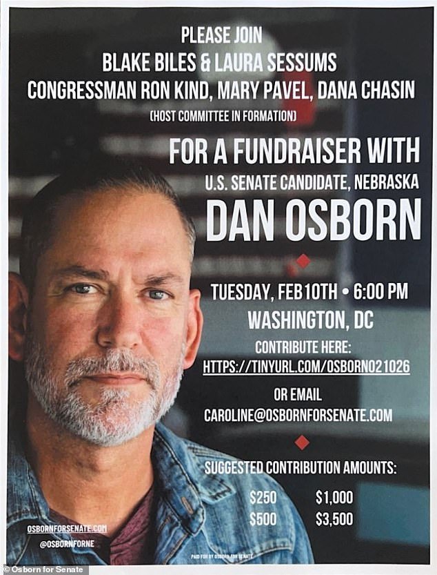 El Daily Mail puede informar que una recaudación de fondos para Dan Osborn, un candidato independiente de Nebraska al Senado de los Estados Unidos, fue abandonada repentinamente, según un correo electrónico de la campaña de Osborn enviado al Daily Mail justo antes de las 2:30 p.m. Martes.