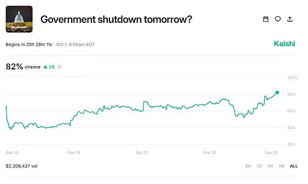 Las posibilidades de una parada en el mercado de predicción de Kalshi subieron 87.3% esta mañana, luego aumentaron al 84%. Esto significa que para cada apuesta de $ 100 en un cierre del gobierno, los jugadores ganan $ 20, París contra $ 489