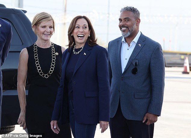 Los representantes Susie Lee (izquierda) y Steven Horsford (derecha) dan la bienvenida a Kamala Harris en Las Vegas, Nevada, el 20 de octubre de 2024.