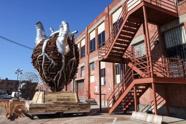 Esculturas del artista Gaele Warner se exhiben para el evento Burning Man’s Decompression en Embarcadero Cove en Oakland, California, el viernes 17 de octubre de 2025. Se espera que miles de artistas, intérpretes y miembros de la comunidad asistan al evento el sábado, que se trasladó de San Francisco a Oakland por primera vez desde finales de la década de 1990. Durante esta celebración cívica que durará un día, se exhibirán presentaciones interactivas en vivo, escenarios musicales e instalaciones comunitarias. (Ray Chávez/Grupo de Noticias del Área de la Bahía)