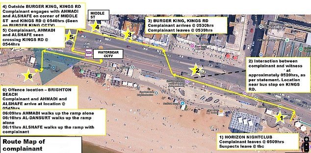 El mapa presentado al tribunal muestra los movimientos de tres solicitantes de asilo que estaban de fiesta en un club nocturno de Brighton antes de la ‘violación en grupo de una mujer borracha solitaria en la playa’