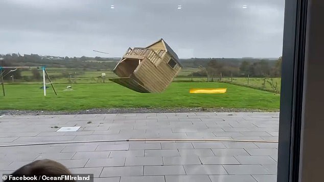 Este es el momento en que una casa de juego fue levantada del suelo y arrastrada a través de un jardín, mientras que los vientos de 100 mph son derrotados por las partes del Reino Unido.