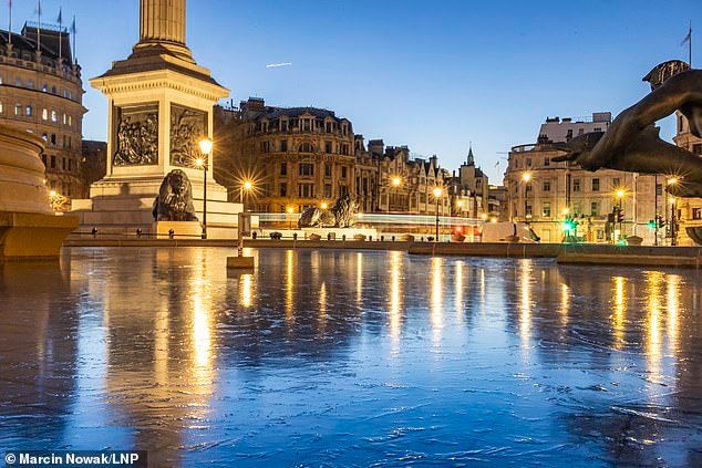Las fuentes y el suelo de Trafalgar Square, en el centro de Londres, se han congelado tras una noche de temperaturas bajo cero en la capital.