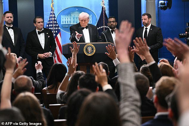 Trump entró al salón de banquetes del Washington Hilton al son de “Salve al Jefe” y saludó a destacados periodistas en el estrado, deteniéndose también para felicitar a la secretaria de prensa de la Casa Blanca, Karoline Leavitt, señalando alegremente.