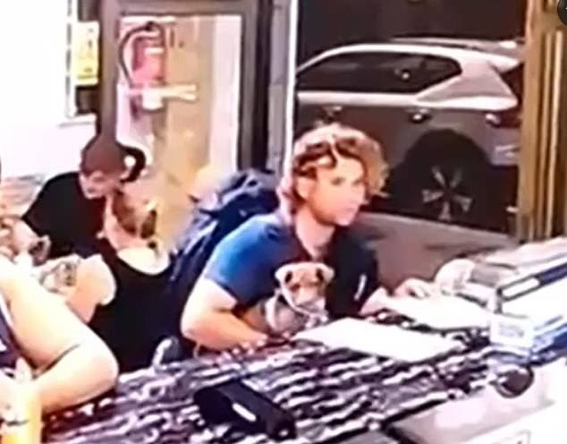En la foto, que fue capturada por cámaras de seguridad, se muestra a James vistiendo una camiseta T Blue mientras se sienta en el mostrador de argumentos con su Jack Russell sentado en su regazo.