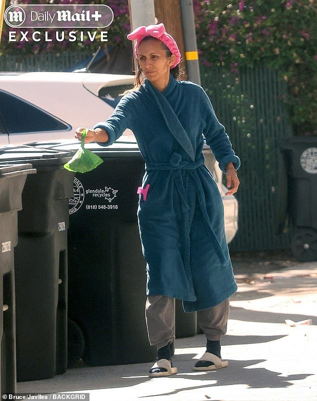 Se la vio caminando hacia el bote de basura con una bata de baño, pantuflas y una diadema de maquillaje.