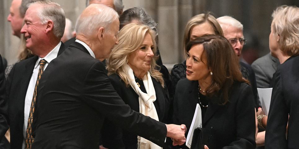 Jill y la exvicepresidenta Kamala Harris tuvieron un encuentro incómodo cuando las dos estaban sentadas una al lado de la otra al comienzo de los servicios.