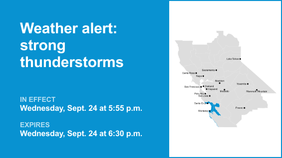 Northern Monterey Bay, Northern Salinas Valley / Hollister Valley y Carmel Valley y Southern Monterey Bay y Big on Coast están en el centro de una alerta de clima actualizada para fuertes tormentas eléctricas publicadas a las 5:55 p.m. Miércoles por el Servicio Meteorológico Nacional. La alerta está en vigor hasta las 6.30 p.m.