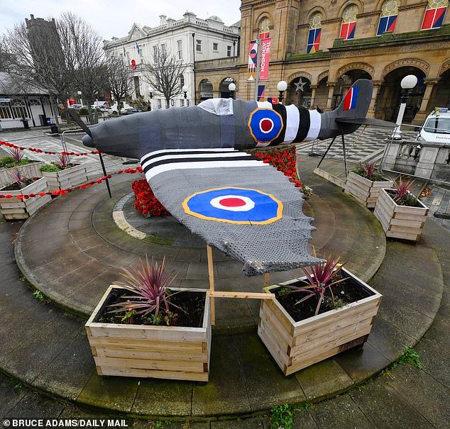 El Spitfire tejido a crochet de tamaño natural, creado por la organización benéfica local Men in Sheds en colaboración con un grupo de bombardeo de hilo, ocupa un lugar de honor fuera del recinto artístico de Southport, The Atkinson, junto al ayuntamiento.