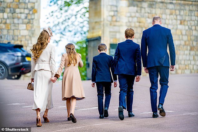 Anteriormente, la realeza había sido guiada a pie por el Príncipe y la Princesa de Gales y sus hijos desde el Castillo de Windsor, a pesar del viento.