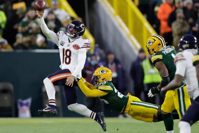 En un cuarto y 1 en el último minuto, los Bears no pudieron correr ni escabullirse para el primer intento. Williams fingió un traspaso y rodó hacia la izquierda. Lanzó un pase en la zona de anotación al ala cerrada Cole Kmet, pero el esquinero de los Packers, Keisean Nixon, estuvo allí para la intercepción que selló la victoria 28-21.