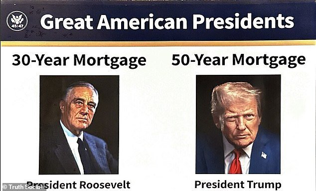 La pieza central de la pintura presentaba una fotografía del ex presidente Franklin Roosevelt y las palabras “hipoteca a 30 años”. También había una foto de Trump, con “hipoteca a 50 años” grabada debajo.
