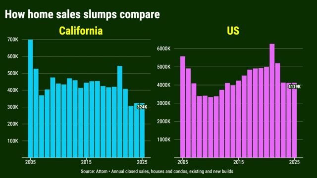 California tuvo 954.423 ventas en 2023-25, frente a 1,25 millones en 2007-09. Como resultado, la compra de viviendas ha sido un 24% más lenta en los últimos tres años que durante la pesadilla inmobiliaria. Sí, hay muchos menos compradores de viviendas en estos días que durante la gran crisis.