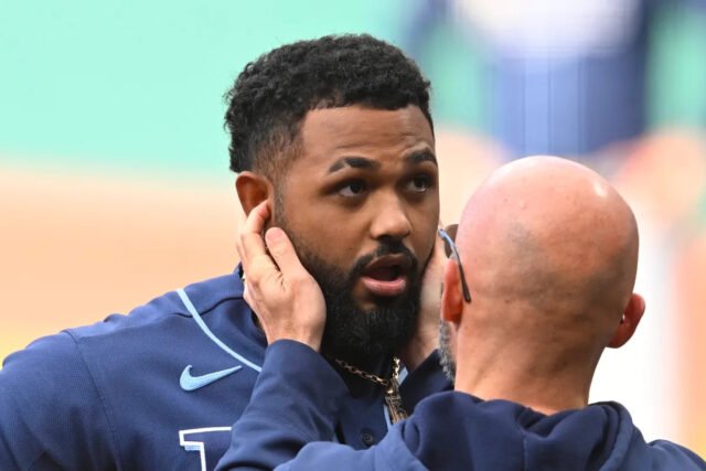 La estrella de los Rays, Junior Caminero, deja la victoria sobre los Guardianes temprano después de recibir una falta en la mandíbula